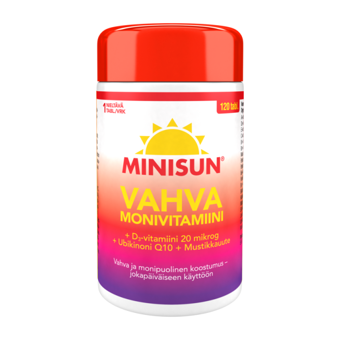 Minisun monivitamiinit ovat helppo tapa turvata päivittäinen vitamiinien ja hivenaineiden saanti ympäri vuoden. Minisun Monivitamiini Vahva on suomalaisille suunniteltu aktiivisen ihmisen monivitamiinivalmiste, joka sisältää vahvan annoksen erityisesti vastustuskykyä vahvistavia vitamiineja. Vahva koostumus antaa lisäenergiaa joka päivä: valmiste sisältää muun muassa reilun annoksen D-vitamiinia, kalsiumia, B12-vitamiinia, foolihappoa ja sinkkiä. Lisäksi tuotteessa on ubikinoni Q10:tä ja mustikkauutetta. Minisun Monivitamiini Vahva sopii erityisesti aktiiviselle aikuisille, liikkujille, stressistä kärsiville ja ikääntyville. Yksi nieltävä tabletti päivässä riittää. Tuote on laktoositon, soijaton, liivatteeton, hiivaton ja maidoton. Ei sisällä gluteenipitoisen viljan ainesosia.